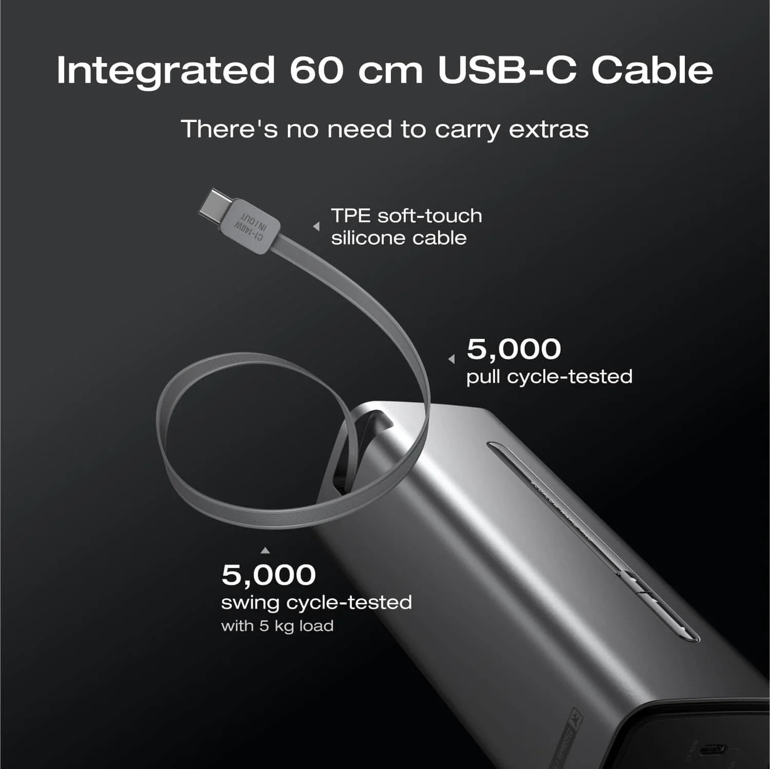 pin của cả sạc dự phòng và thiết bị trong khi sạc. - Cáp tích hợp dài 60 cm: Không cần phải mang theo